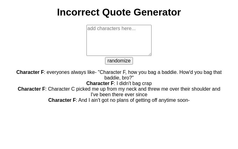 Insults about how gross they are. The Incorrect Quotes Generator blesses my dash and I am LOSING IT Incorrect Quotes Generator. ScatterPatters Incorrect Quotes Generator.